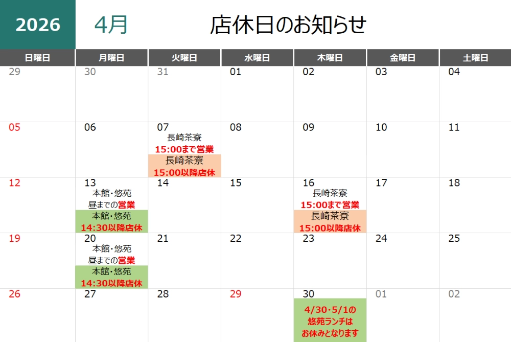 なお、4/29~5/6まで悠苑ランチはお休みとなります。